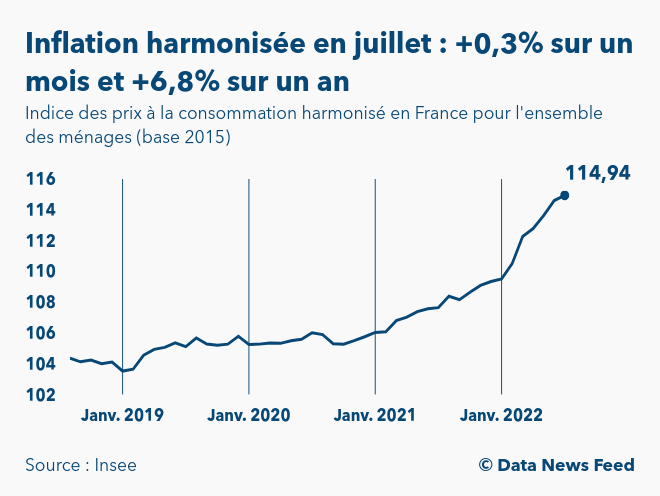 Selon les données définitives publiées par l’Institut national de la statistique et des études économiques (Insee) à 8h45, l’indice des prix à la consommation harmonisé (IPCH) en France ressort à 114,9 points en juillet 2022 (base 100 en 2015). Ainsi, le niveau d’inflation harmonisé s’élève à+0,3% sur un mois et à +6,8% sur un an.