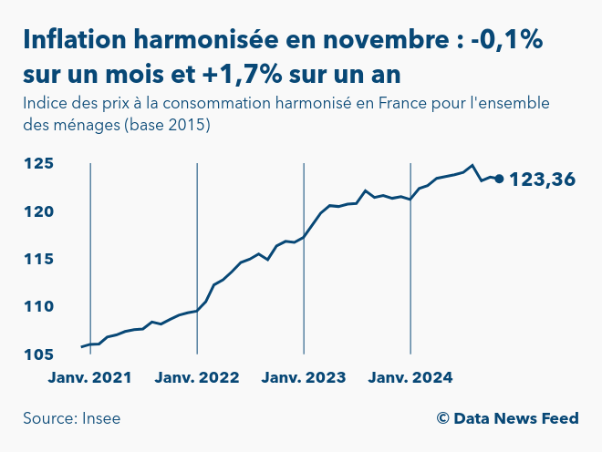 Selon les données définitives publiées par l'Institut national de la statistique et des études économiques (Insee) à 8h45, l'indice des prix à la consommation harmonisé (IPCH) en France ressort à 123,36 points en novembre 2024 (base 100 en 2015). Ainsi, le niveau d'inflation harmonisé atteint -0,1% sur un mois et à +1,7% sur un an.