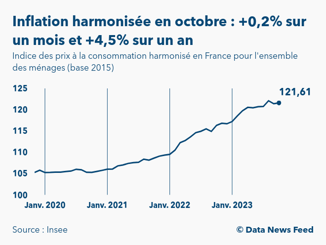 Selon les données définitives publiées par l’Institut national de la statistique et des études économiques (Insee) à 8h45, l’indice des prix à la consommation harmonisé (IPCH) en France ressort à 121,6 points en octobre 2023 (base 100 en 2015). Ainsi, le niveau d’inflation harmonisé s’élève à+0,2% sur un mois et à +4,5% sur un an.