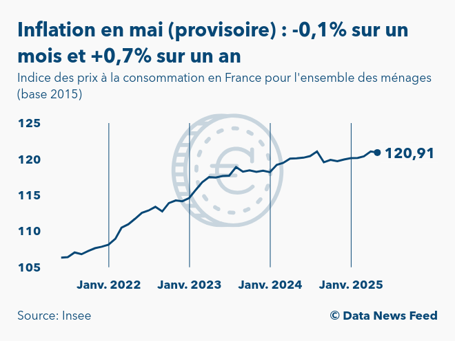 Selon les données provisoires publiées par l'Institut national de la statistique et des études économiques (Insee) à 8h45, l'indice des prix à la consommation (IPC) en France s'établirait à 120,91 points en mai 2025 (base 100 en 2015). Ainsi, l'inflation ressortirait à -0,1% sur un mois et à +0,7% sur un an.