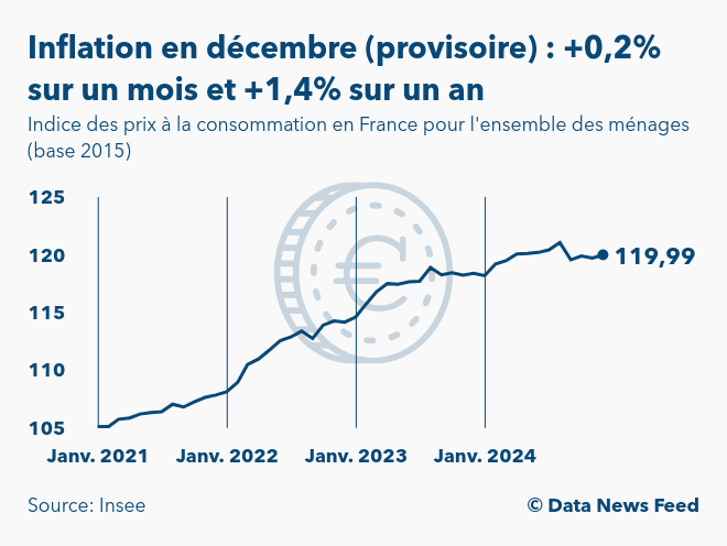 Selon les données provisoires publiées par l'Institut national de la statistique et des études économiques (Insee) à 8h45, l'indice des prix à la consommation (IPC) en France s'établirait à 119,99 points en décembre 2024 (base 100 en 2015). Ainsi, l'inflation ressortirait à +0,2% sur un mois et à +1,4% sur un an.