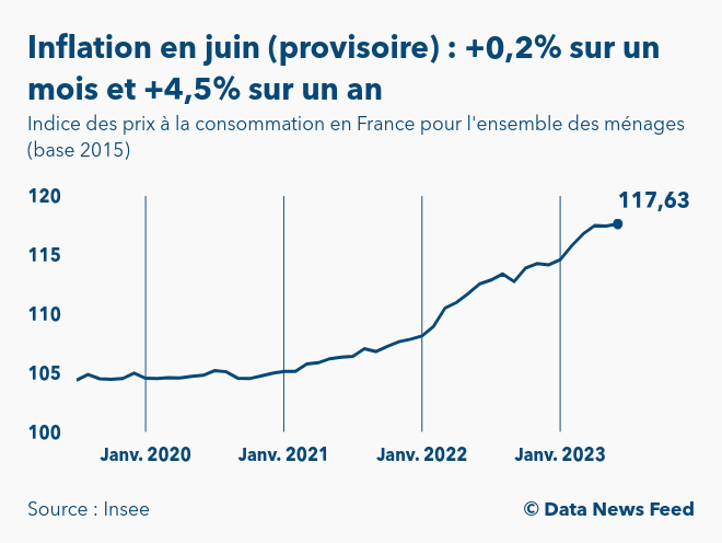 Selon les données provisoires publiées par l’Institut national de la statistique et des études économiques (Insee) à 8h45, l’indice des prix à la consommation (IPC) en France s’établirait à 117,6 points en juin 2023 (base 100 en 2015). Ainsi, l’inflation ressortirait à +0,2% sur un mois et à +4,5% sur un an.