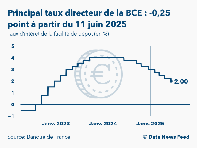 Le Conseil des gouverneurs de la Banque centrale européenne (BCE) a décidé d'abaisser le principal taux d'intérêt à 2%. Ainsi, le taux de facilité de dépôt diminue de 25 points de base. Cette décision de politique monétaire prendra effet à compter du 11 juin 2025.