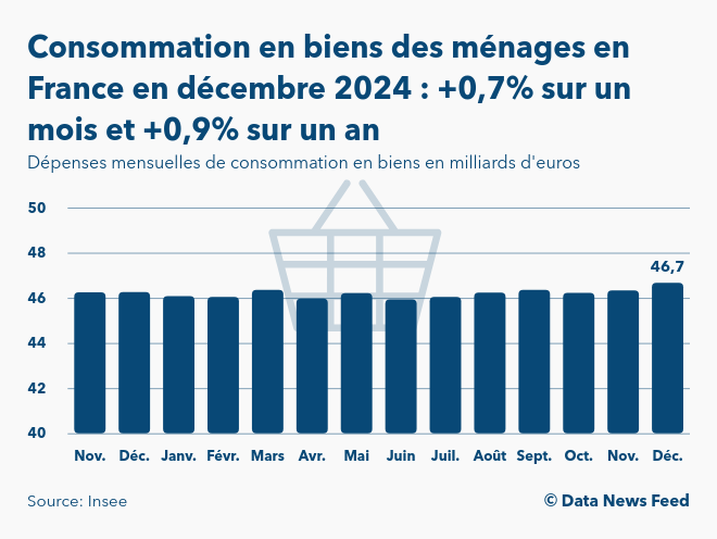 En décembre 2024, les dépenses de consommation en biens des ménages en France ont atteint 46,66 milliards d'euros, en croissance de 0,7% par rapport au mois précédent, selon les chiffres de l'Institut national de la statistique et des études économiques (Insee) publiés à 7h30. Sur un an, la consommation est donc en hausse de 0,9% (46,26 milliards d'euros en décembre 2023).
