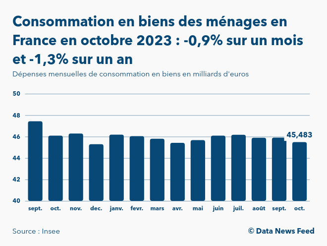 Le mois précédent, en septembre 2023, les ménages avaient dépensé 45,9 milliards d’euros (chiffre qui vient d’être révisé par l’Insee) pour leurs achats de biens, stable sur un mois et 3,2% de moins sur un an.