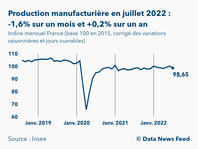 En France, l’indice de la production manufacturière est ressorti à 98,7 points en juillet 2022 (base 100 en 2015), selon un communiqué de l’Institut national de la statistique et des études économiques (Insee) publié à 8h45. Ainsi, la production dans l’industrie manufacturière a baissé de 1,6% sur un mois et a augmenté de 0,2% sur un an.