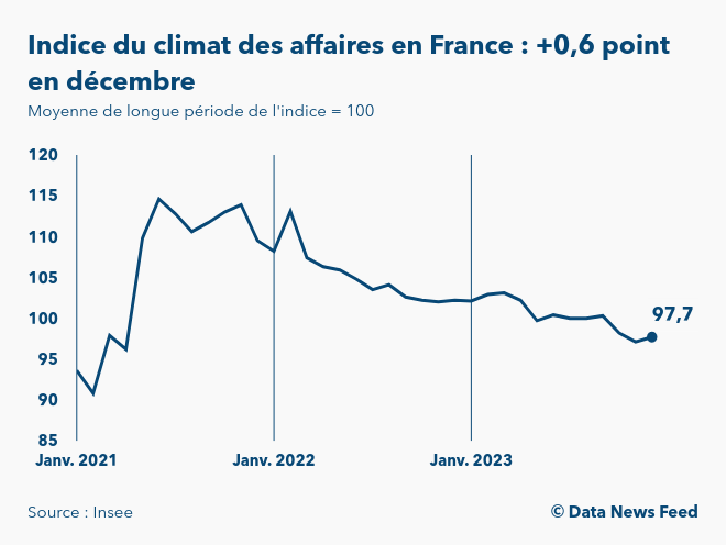 Selon les données publiées par l’Institut national de la statistique et des études économiques (Insee) à 8h45, l’indice synthétique du climat des affaires en France ressort à 97,7 points en décembre 2023. Ainsi, le moral des patrons s’est amélioré de 0,6 point sur un mois. L’indice se situant légèrement au-dessous de sa moyenne de longue période (100), l’opinion des chefs d’entreprises sur la conjoncture est quelque peu mauvaise.
