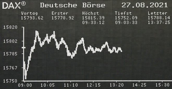 Un panneau affichant l'évolution du cours du Dax, à la Bourse de Francfort, le 27 août 2021 (AFP/Archives/Daniel ROLAND)