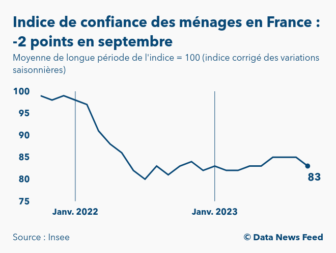 Selon les données publiées par l’Institut national de la statistique et des études économiques (Insee) à 8h45, l’indice synthétique de confiance des ménages en France ressort à 83 points en septembre 2023. Ainsi, le moral des ménages s’est détérioré de 2 points sur un mois. L’indice se situant nettement au-dessous de sa moyenne de longue période (100), l’opinion des ménages français sur la situation économique est particulièrement négative.