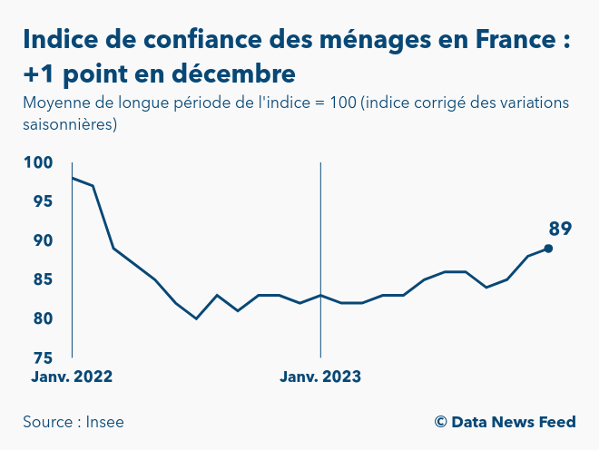 Selon les données publiées par l’Institut national de la statistique et des études économiques (Insee) à 8h45, l’indice synthétique de confiance des ménages en France ressort à 89 points en décembre 2023. Ainsi, le moral des ménages s’est amélioré de 1 point sur un mois. L’indice se situant nettement au-dessous de sa moyenne de longue période (100), l’opinion des ménages français sur la situation économique est particulièrement négative.