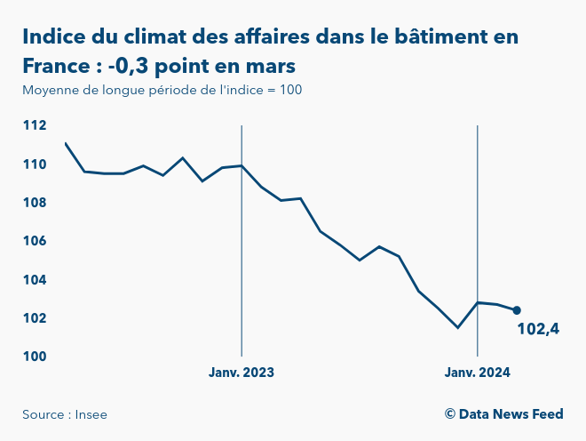 L’indice synthétique du climat des affaires dans l’industrie du bâtiment en France s’établit à 102,4 points en mars 2024, a indiqué l’Institut national de la statistique et des études économiques (Insee) à 8h45. Ainsi, le moral des chefs d’entreprises du secteur a diminué de 0,3 point sur un mois. L’indice se situant légèrement au-dessus de sa moyenne de longue période (100), l’opinion des chefs d’entreprises dans le bâtiment sur l’évolution de la conjoncture est quelque peu favorable.