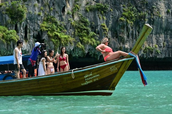 Des touristes dans une baie des îles Phi Phi en Thaïlande, le 26 novembre 2021 (AFP/Lillian SUWANRUMPHA)