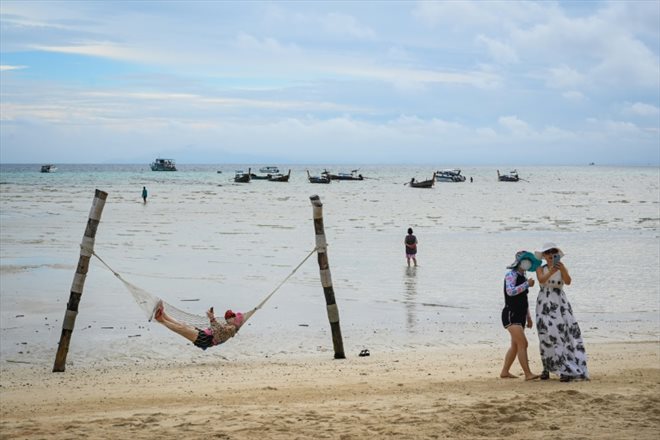 Des touristes sur une plage des îles Phi Phi en Thaïlande, le 26 novembre 2021 (AFP/Lillian SUWANRUMPHA)