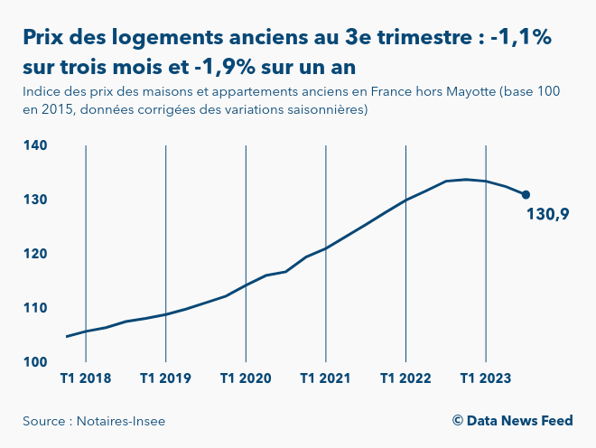 Selon les indices Notaires-Insee publiés ce matin à 8h45, les prix des logements anciens (maisons et appartements) en France (hors Mayotte) au 3e trimestre 2023 reculent de 1,1% par rapport au trimestre précédent. Sur un an, les prix de l’immobilier ancien diminuent de 1,9% (en données corrigées des variations saisonnières).