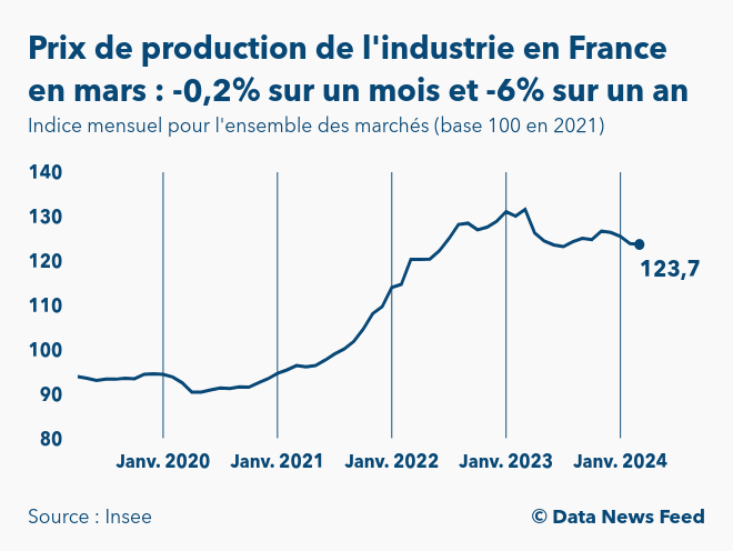 Selon un communiqué de l’Institut national de la statistique et des études économiques (Insee) publié à 8h45, l’indice des prix de production de l’industrie (IPPI) française est ressorti à 123,7 points en mars 2024 (base 100 en 2021). Ainsi, les prix de production ont baissé de 0,2% sur un mois et ont reculé de 6% sur un an.
