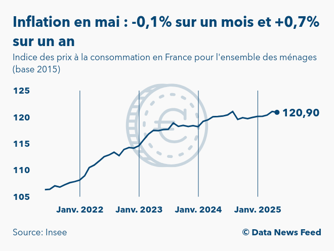 Selon les données définitives publiées par l'Institut national de la statistique et des études économiques (Insee) à 8h45, l'indice des prix à la consommation (IPC) en France s'est établi à 120,9 points en mai 2025 (base 100 en 2015). Ainsi, l'inflation ressort à -0,1% sur un mois et à +0,7% sur un an.