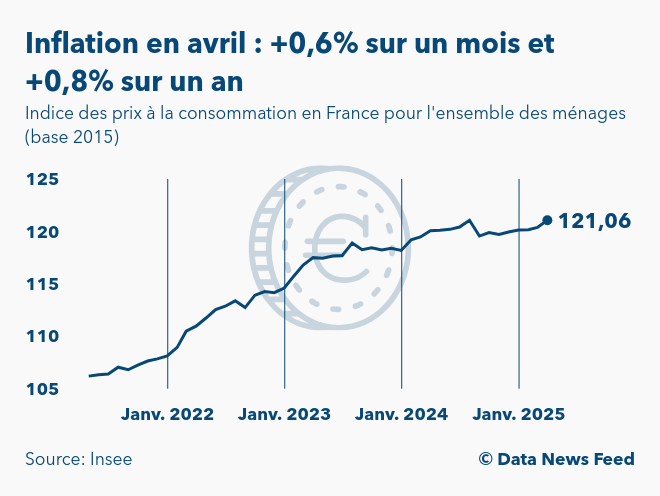 Selon les données définitives publiées par l'Institut national de la statistique et des études économiques (Insee) à 8h45, l'indice des prix à la consommation (IPC) en France s'est établi à 121,06 points en avril 2025 (base 100 en 2015). Ainsi, l'inflation ressort à +0,6% sur un mois et à +0,8% sur un an.