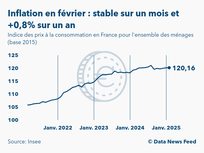 Selon les données définitives publiées par l'Institut national de la statistique et des études économiques (Insee) à 8h45, l'indice des prix à la consommation (IPC) en France s'est établi à 120,16 points en février 2025 (base 100 en 2015). Ainsi, l'inflation est restée stable sur un mois et à +0,8% sur un an.