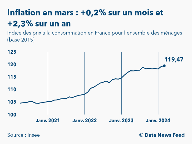 Selon les données définitives publiées par l’Institut national de la statistique et des études économiques (Insee) à 8h45, l’indice des prix à la consommation (IPC) en France s’est établi à 119,5 points en mars 2024 (base 100 en 2015). Ainsi, l’inflation ressort à +0,2% sur un mois et à +2,3% sur un an.