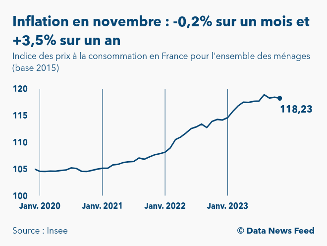 Selon les données définitives publiées par l’Institut national de la statistique et des études économiques (Insee) à 8h45, l’indice des prix à la consommation (IPC) en France s’est établi à 118,2 points en novembre 2023 (base 100 en 2015). Ainsi, l’inflation ressort à -0,2% sur un mois et à +3,5% sur un an.