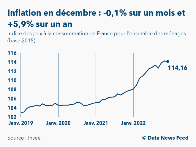 Selon les données définitives publiées par l’Institut national de la statistique et des études économiques (Insee) à 8h45, l’indice des prix à la consommation (IPC) en France s’est établi à 114,2 points en décembre 2022 (base 100 en 2015). Ainsi, l’inflation ressort à -0,1% sur un mois et à +5,9% sur un an.