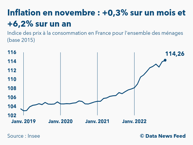 Selon les données définitives publiées par l’Institut national de la statistique et des études économiques (Insee) à 8h45, l’indice des prix à la consommation (IPC) en France s’est établi à 114,3 points en novembre 2022 (base 100 en 2015). Ainsi, l’inflation ressort à +0,3% sur un mois et à +6,2% sur un an.