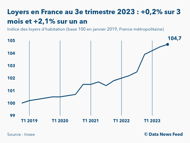 Au 3e trimestre 2023, l’indice des loyers d’habitation (ILH) est en hausse de 0,2% sur 3 mois, à 104,7 points, selon un communiqué de l’Institut national de la statistique et des études économiques (Insee) publié à 12h. Au trimestre précédent, les loyers (hors charges) pour les résidences principales en France métropolitaine avaient progressé de 0,3%.