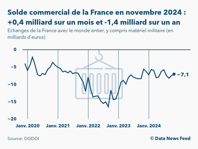 Selon les chiffres de la Direction générale des douanes, le solde commercial de la France s’élève à -7,1 milliards d'euros en novembre 2024. Le déficit du commerce extérieur se réduit ainsi de 0,4 milliard d'euros par rapport au mois précédent. Sur un an, le solde des échanges commerciaux de la France avec le monde entier se dégrade de 1,4 milliard d'euros.