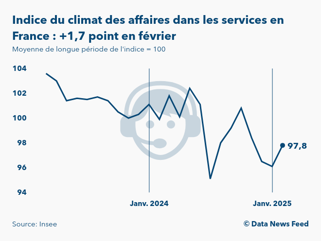 Selon un communiqué de l'Institut national de la statistique et des études économiques (Insee) publié à 8h45, l'indice synthétique du climat des affaires dans les services en France ressort à 97,8 points en février 2025. Ainsi, le moral des patrons dans les services s'est amélioré de 1,7 point sur un mois. L’indice se situant légèrement au-dessous de sa moyenne de longue période (100), l’opinion des chefs d’entreprises de services sur la conjoncture est quelque peu mauvaise.