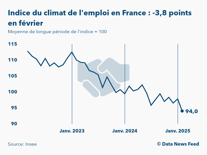 L'indice du climat de l'emploi en France ressort à 94 points en février 2025, selon les chiffres de l'Institut national de la statistique et des études économiques (Insee) publiés à 8h45. Ainsi, cet indicateur issu des enquêtes de conjoncture réalisées auprès des chefs d'entreprises a diminué de 3,8 points sur un mois. L’indice se situant au-dessous de sa moyenne de longue période (100), l’opinion des chefs d’entreprises sur l'emploi salarié est donc mauvaise.