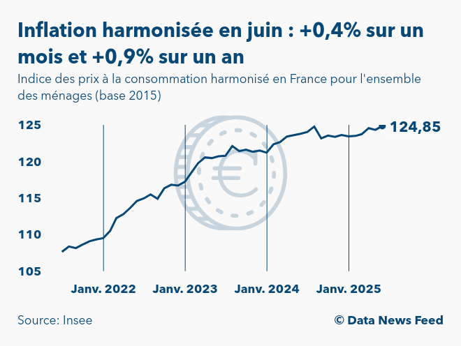 Selon les données définitives publiées par l'Institut national de la statistique et des études économiques (Insee) à 8h45, l'indice des prix à la consommation harmonisé (IPCH) en France ressort à 124,85 points en juin 2025 (base 100 en 2015). Ainsi, le niveau d'inflation harmonisé s'élève à +0,4% sur un mois et à +0,9% sur un an.