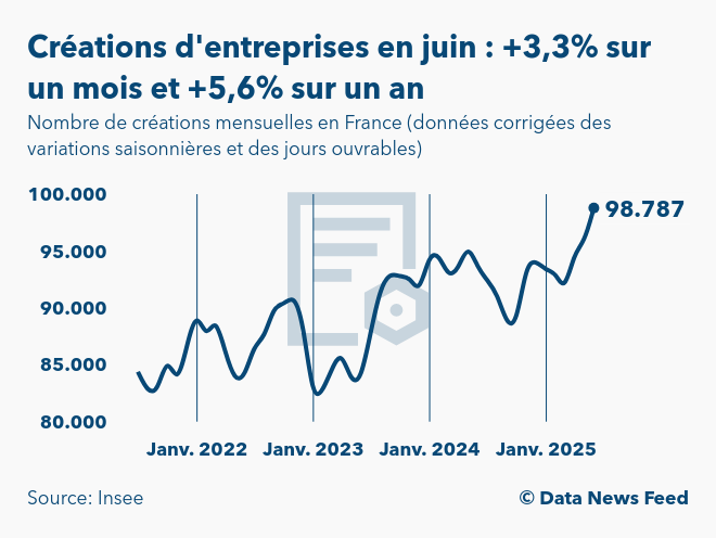 En juin 2025, le nombre de créations d'entreprises en France est ressorti à 98.787, soit une hausse de 3,3% sur un mois, selon les données publiées à 8h45 par l'Institut national de la statistique et des études économiques (Insee). Par rapport à juin 2024, les immatriculations d'entreprises sont en hausse de 5.237 unités, soit 5,6% de plus. Le mois dernier, la France avait enregistré 95.672 créations d’entreprises (+0,8% sur un mois et stable sur un an).