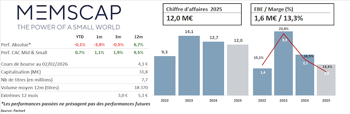 Pour l'exercice à venir, nous pensons que le groupe est idéalement positionné pour retrouver une trajectoire de croissance à deux chiffres. La défense et l’aéronautique profitent d'un environnement propice et sont devenus les fers de lance des marchés boursiers. Nous pensons ainsi que Memscap est idéalement positionnée pour continuer sur la trajectoire amorcée en fin d'exercice 2025. Par ailleurs, la signature récente des contrats de développement avec Parker Hannifin et Meggit dans les applications de contrôle moteur et de systèmes fluidique constitue un signal fort de reconnaissance technologique des capteurs MEMS du groupe et améliore sensiblement les perspectives d'une croissance rentable à moyen terme.