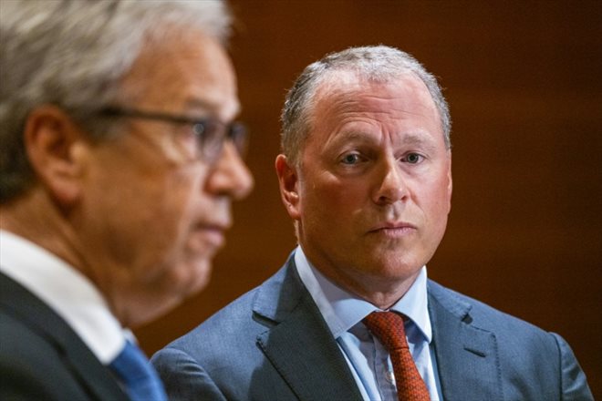 Øystein Olsen (g), le gouverneur de la Banque de Norvège, et Nicolai Tangen, le 28 mai 2020 à Oslo (NTB Scanpix/AFP/Archives/Håkon Mosvold Larsen)