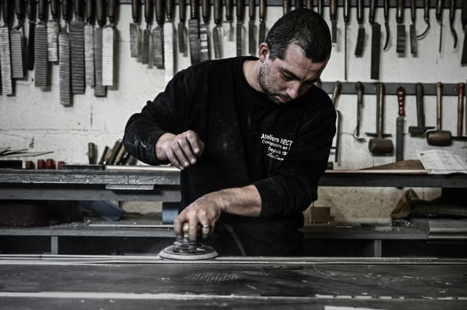 Dans un coin de l'atelier, Matthias Goncalves s'affaire au ponçage des soudures d'un comptoir de 12 mètres de longueur.