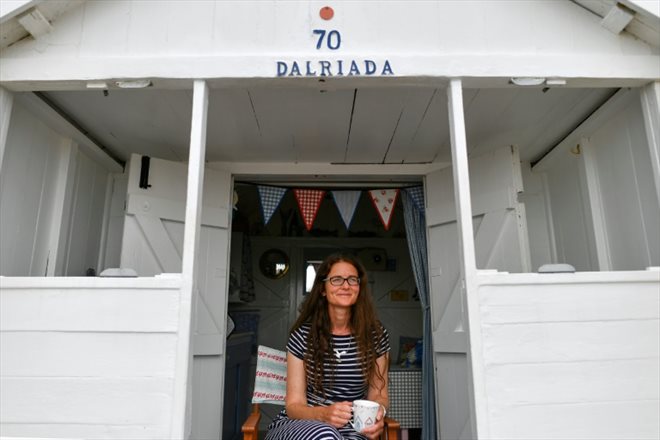 Dans sa mini-maison jaune et blanche, Melanie Whitehead contemple la mer du Nord, une tasse de thé bien chaud à la main. Cette ex-urbaniste n'utilise pas sa cabane dans son but historique -se mettre en maillot de bain à l'abri des regards- mais plutôt pour profiter du cadre tout en étant confortablement installée.