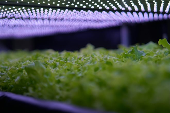 Afin d'assurer des récoltes très régulières - 15 fois par an ici -, les produits qui ne voient pas la lumière du jour sont perpétuellement éclairés.