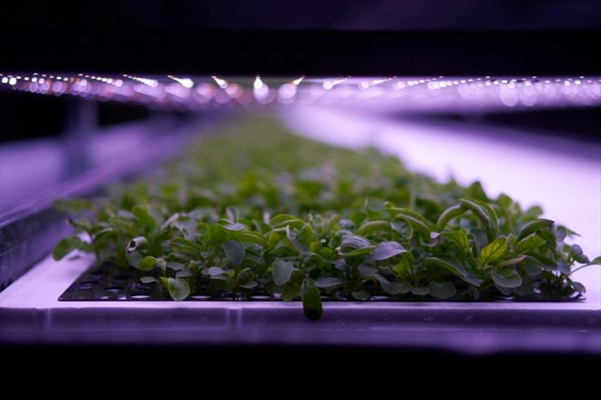 Un halo violet court au-dessus de casiers où pousseront bientôt laitues, herbes aromatiques et chou kale: dans un entrepôt banal d'une zone industrielle de la banlieue de Copenhague se cache une des plus grandes fermes "verticales" d'Europe, inaugurée cette semaine.