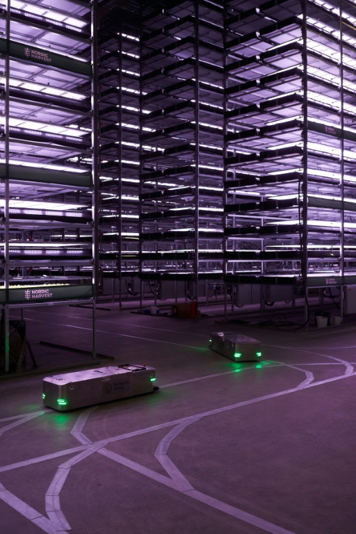 D'immenses étagères de 14 niveaux, hautes de 10 mètres et éclairées par un total de 20.000 ampoules LED, remplissent du sol au plafond ce vaste hangar de 7.000 mètres carrés, exploité par la start-up danoise Nordic Harvest.