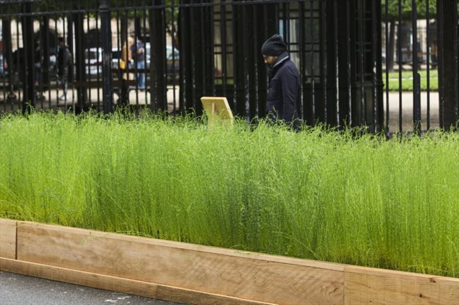 Un petit champ de lin a été installé cette semaine pour un mois et demi en face de la mairie de Paris et devant un grand magasin. Des chants d'oiseaux enregistrés sont audibles au milieu des bruits des voitures.